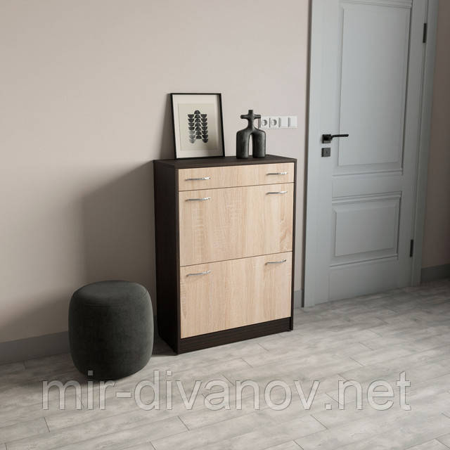 Обувница виготовлена з ламінованого ДСП 16мм. Є висувний ящики та дві секції, в кожну з яких вміщається 2 ряду взуття.